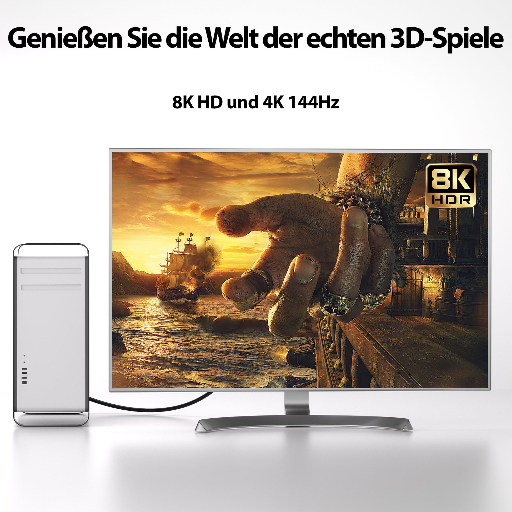 - Datenübertragung ohne DSC Compression und ohne Chroma Subsampling: 8 k: 7680 x 4320 @ 30 Hz | 4k: 3840 x 2160 @ 120 Hz | 2k: 2560 x 1440 @ 240 Hz | 1k: 1920 x 1200 @ 240 Hz